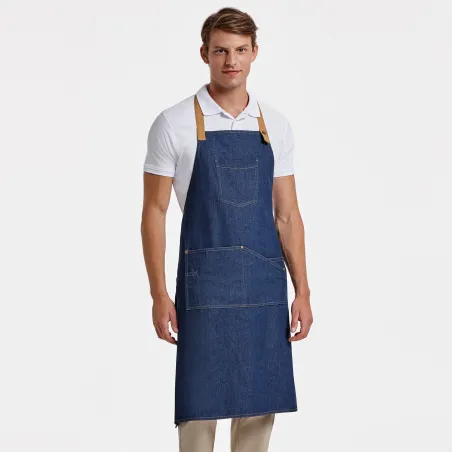 Delantal largo en tejido vaquero, específico para alimentación. Con cinta del cuello ajustable con botón metálico. Cintas laterales a contraste para lazada. 5 bolsillos, uno en el pecho y cuatro frontales, uno de ellos para el bolígrafo.